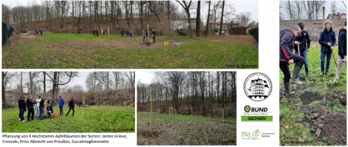 23.03.2023: Schüler der 9. Klasse pflanzten 4 Apfelbäume in Nossen auf dem Gelände des Geschwister-Scholl-Gymnasiums im Rahmen des BUND Sachsen e.V. - Projektes: "Wegweiser Wildbiene – Wildbienenschutz im Landkreis Meißen“ als Ergänzung zu den bereits gepflanzten beiden Apfelbäumen aus der Initiative „Apfelbäumchen für Sachsens Schulen und Kitas“. Ziel ist die Entwicklung einer Streuobstwiese als Saumbereich zum Übergang vom Traubeneichen-Hainbuchenwald in den besiedelten Raum und zu kleinflächigen Wiesen. Koordiniert wurde das Projekt vom DVL – Landesverband Sachsen e.V., Regionalbüro Meißen.
