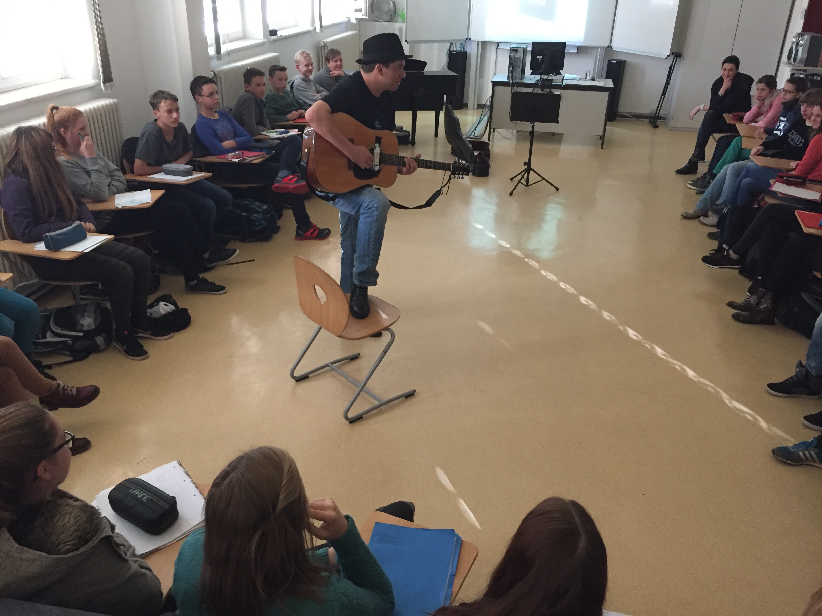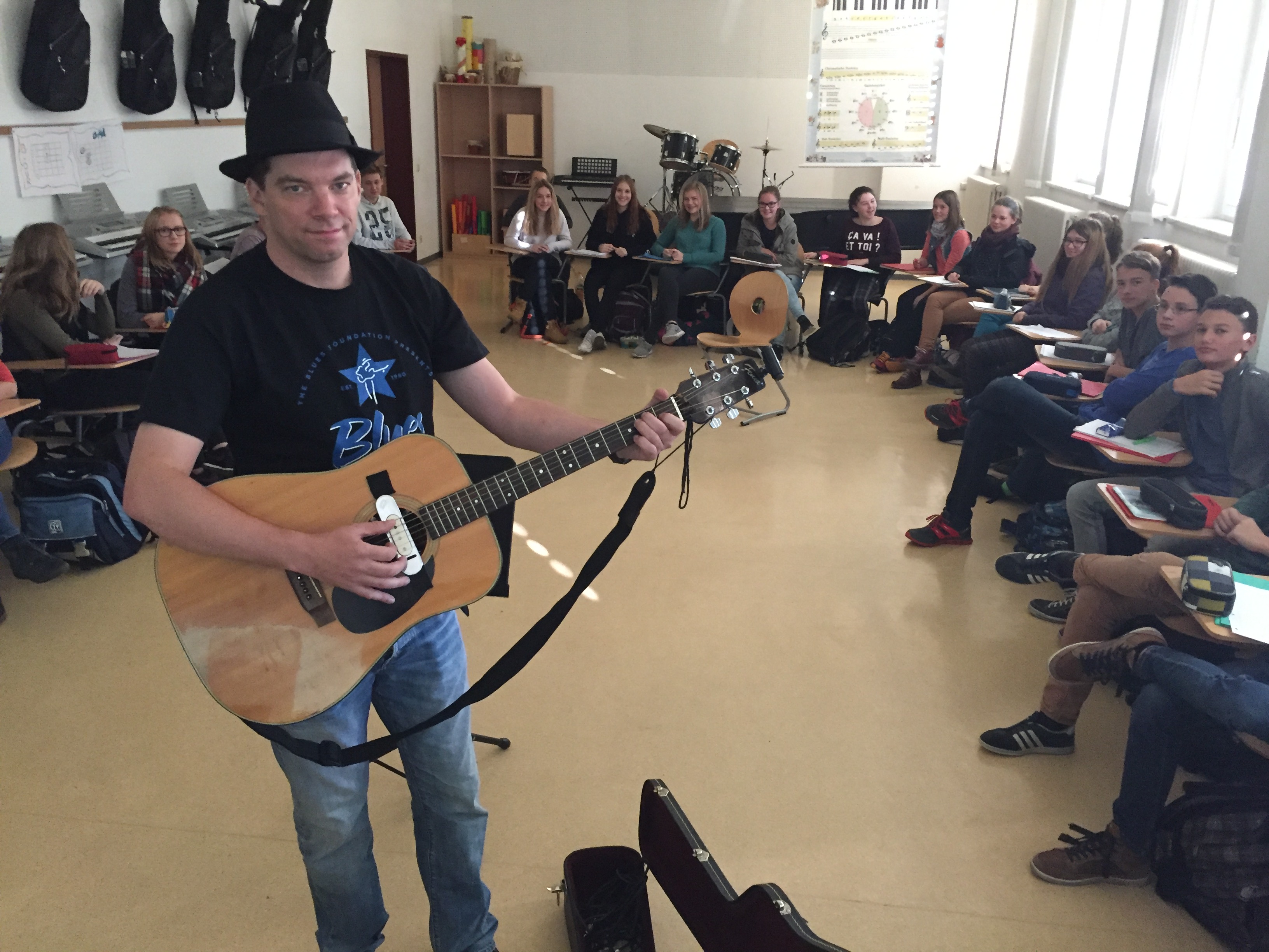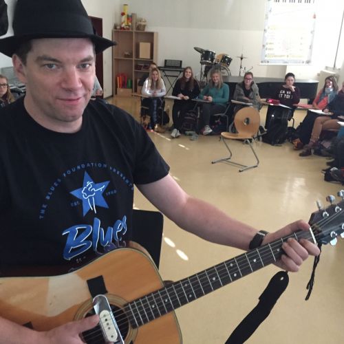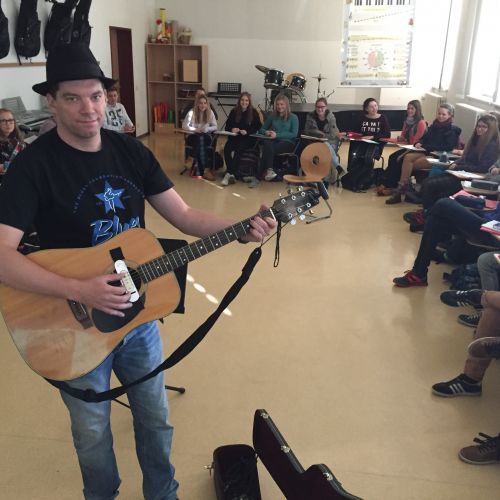 Im Musikunterricht zeigte er sein Können und erzählte von seiner letzten Reise nach Memphis und ins Mississippi-Delta. Die Schüler bekamen allerlei Wissenswertes zum Ursprung der Blues Musik und den verschiedenen Spielweisen und Instrumenten zu hören. Erstaunt waren viele darüber, wie sehr doch der Blues unsere moderne Popmusik geprägt hat und dies immer noch tut. Wer ihn Live erleben möchte, hat dafür noch am 04.11. auf Burg Mildenstein (Leisnig) oder am 06.11. im Brauhof Freiberg die Möglichkeit.