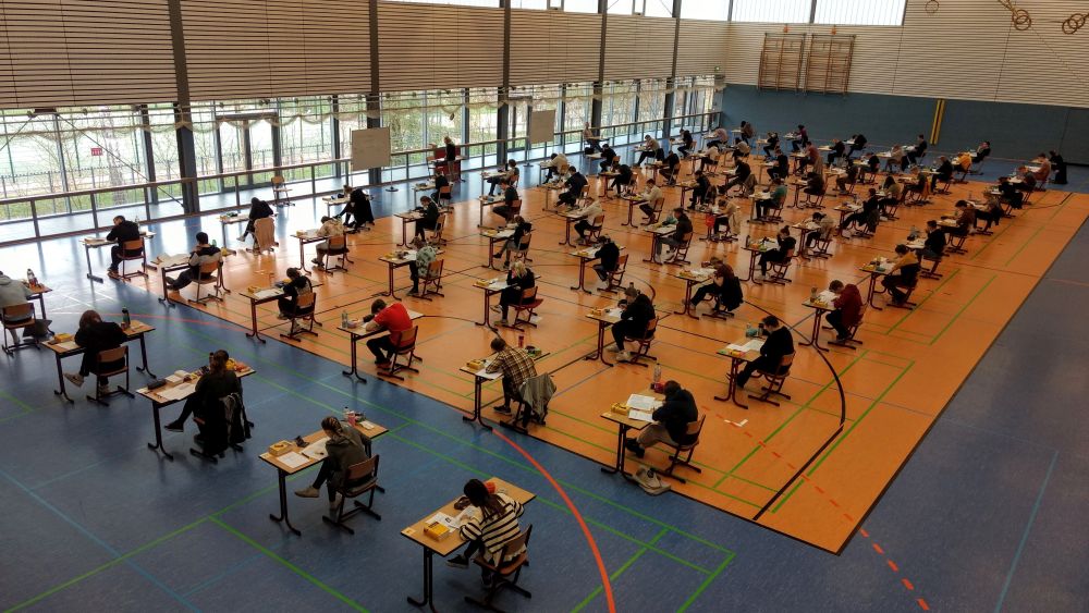 Mit der Deutschprüfung begannen die Abiturprüfungen in diesem Jahr. Gespannte Arbeitsatmosphäre bei den Schülerinnen und Schülern in der Sporthalle. Viel Erfolg!