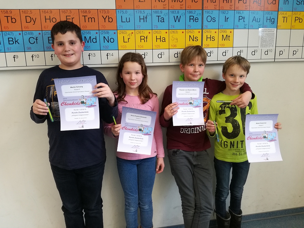Martin Schurig (6/3), Anna Ehrhardt (5/1), Theodor von Ramin-Marro (6/3) und Alexis Suworow (5/2) (v. l.) waren beim Experimentalwettbewerb Chemkids der Klassenstufen 4 bis 8 erfolgreich.