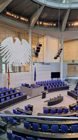 Unser Guide führte uns in die Zuschauerränge über den Sitzen der Abgeordneten und begann eine Menge Wissenswertes über den Bundestag zu erzählen. Wir lernten, dass dieser durch den Boden belüftet wird und der Bundestagsadler an der Wand die Größe einer durchschnittlichen 2-Raum-Wohnung besitzt.