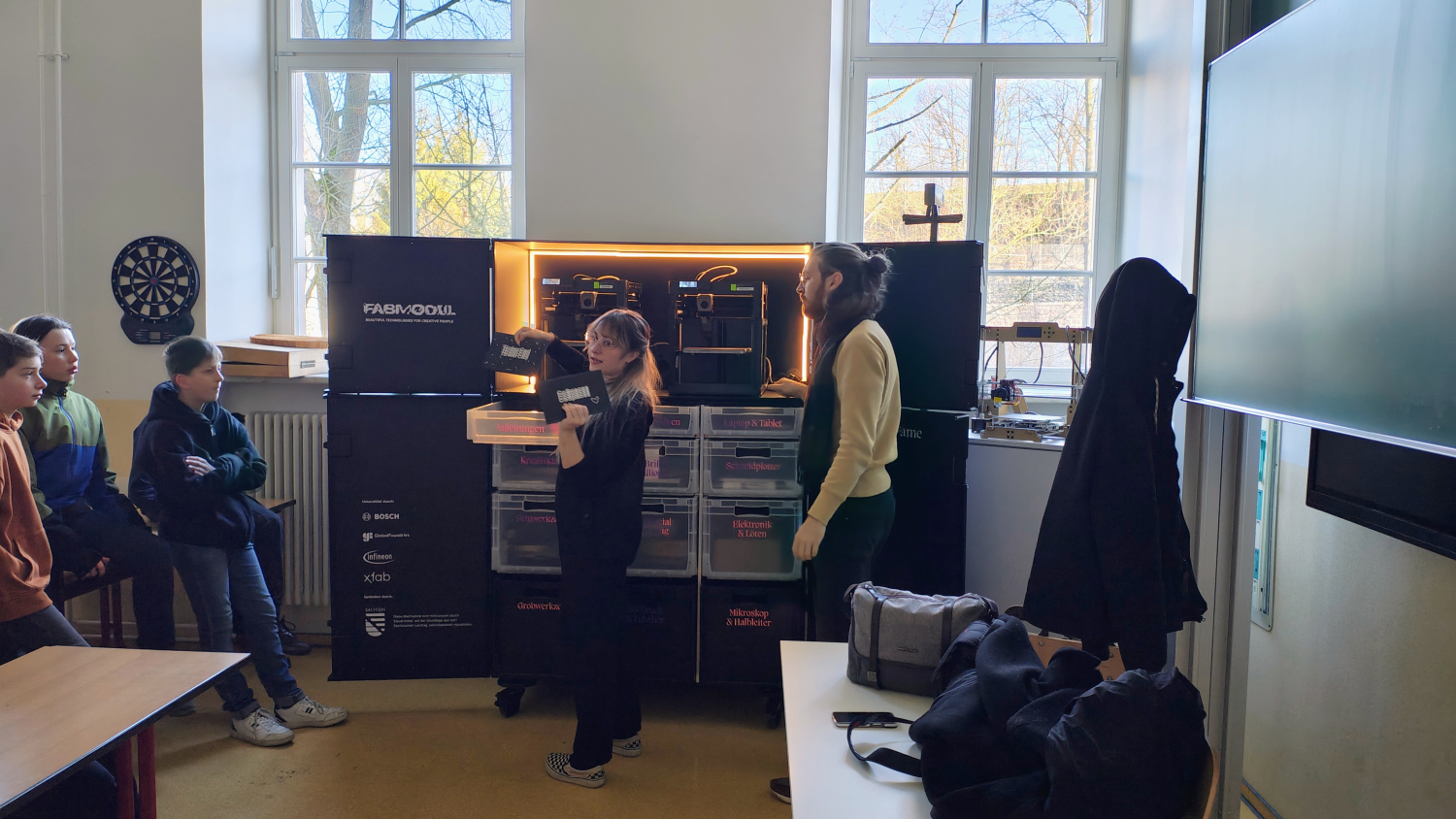 Anfang März war das Fabmobil zum dritten Mal an unserer Schule zu Gast. Dieses Mal war es etwas Besonderes, denn wir sollten ein Fabmodul, ein stationäres Labor mit 3D-Druckern, Schneidplotter und einer VR-Brille erhalten.