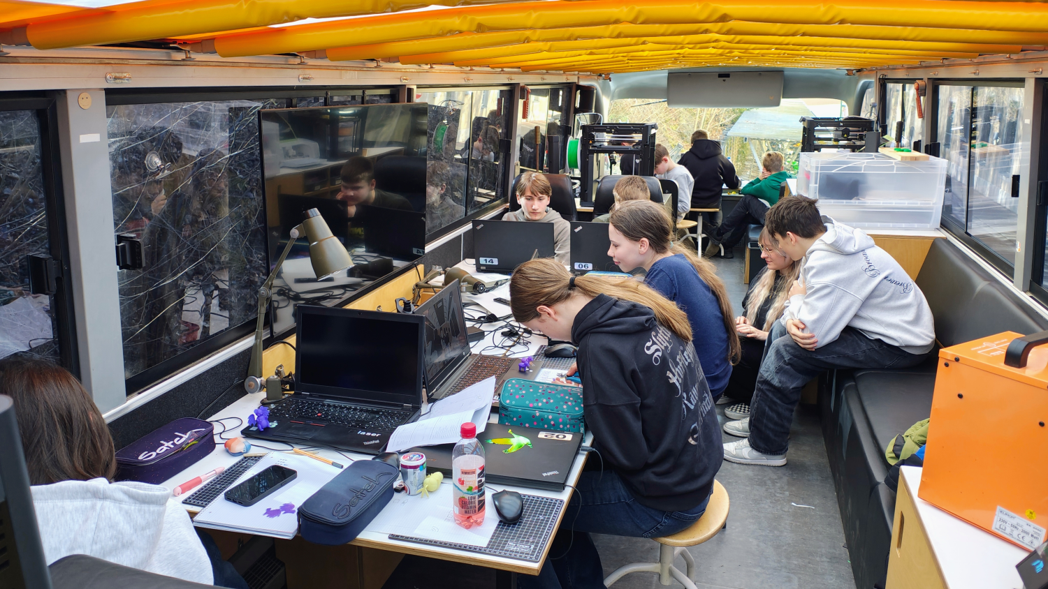 Es ist ausgestattet mit einer vielseitigen Auswahl an Werkzeugen und Maschinen wie z.B. Lastercutter, Bohrer, 3D-Drucker und Plotter. Was es im Fabmobil auch gab waren viele Laptops, die wir zum Arbeiten genutzt haben.