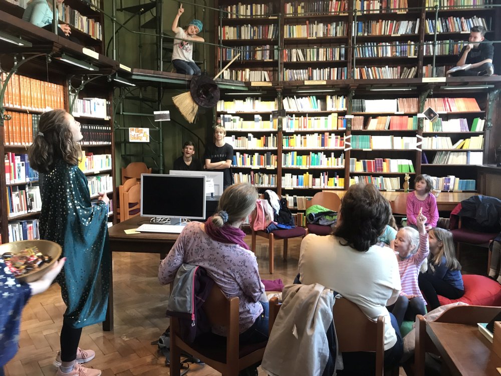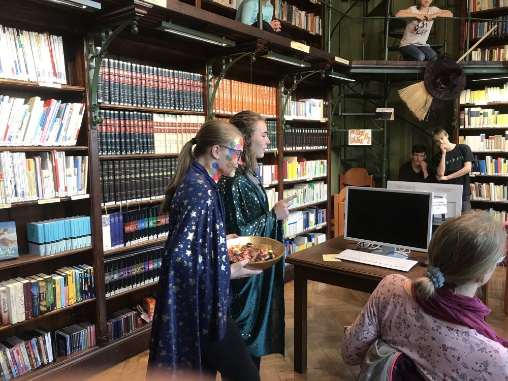 Als wir an diesem Morgen in der Schule ankamen, begannen sofort die letzten Vorbereitungen: Kostüme anziehen, Schminke auftragen, noch einmal den Ablauf durchgehen. Pünktlich um 8 Uhr waren sie auch schon da, die Drittklässler der Grundschule Nossen. Nach der Begrüßung starteten wir mit unserem Programm. Zu Beginn gab es ein Rätsel für die Kinder: Sie sollten anhand von kleinen Szenen das dargestellte Märchen erraten, was sie zu unserer Freude immer gut meisterten. Danach spielten wir unsere eigenen, modernen Fassungen von Frau Holle und Rotkäppchen vor. Im Anschluss lasen wir den Schülern aus „Bibi und Tina“ vor. Dazu sangen wir auch zwei Lieder aus dem Film: „Jungs gegen Mädchen“ und „Happy End“. Das kam natürlich super an und einige Mädchen der Grundschule sangen textsicher und eifrig mit. Als wir danach in der Bibliothek ein Quiz veranstalteten, waren die Kinder begeistert bei der Sache und spekulierten munter drauf los. Dort gab es dann auch noch ein paar Geschichten über große und kleine Helden, von uns vorgelesen, die den Grundschülern sehr gut gefielen. Zum Abschluss durften sich die Drittklässler in der Bibliothek noch ein bisschen umsehen.