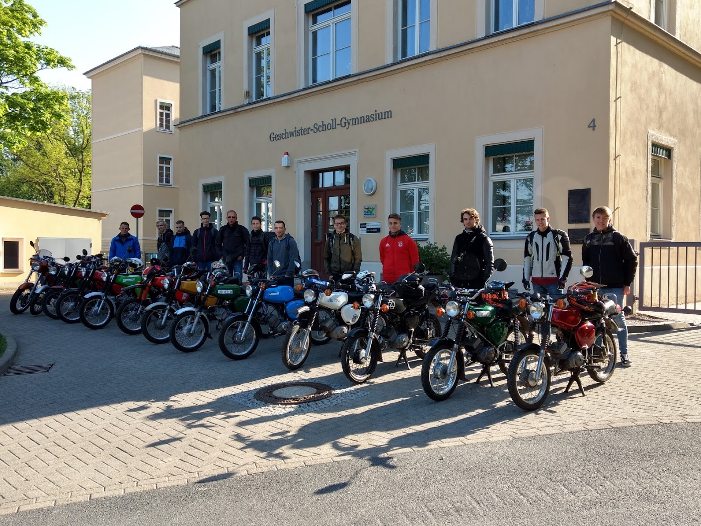 Halb Neun war Treffpunkt an der Schule. Die Truppe wurde ergänzt durch einen erfahrenen Simmen-Schrauber und den Lehrer, der leider nur auf einer 650er Aprilia dabei war, also nicht ganz stilgerecht.
