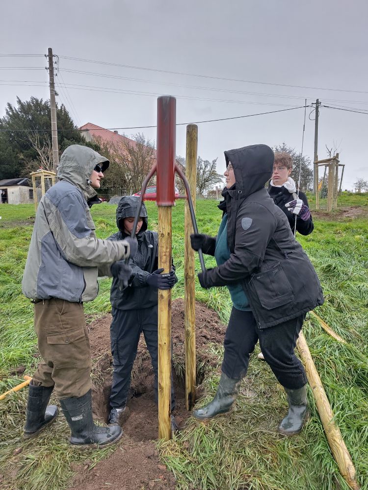 Trotz Regen setzte der 12er Jahrgang in Kaisitz 25 Hochstamm- Obstbäume unter professioneller Anleitung in die Erde. Unter diesen Wetterbedingungen keine einfache Sache, aber die Motivation war gut und nach drei Stunden war es geschafft. Eine neue Streuobstwiese war entstanden, alle waren sehr zufrieden.