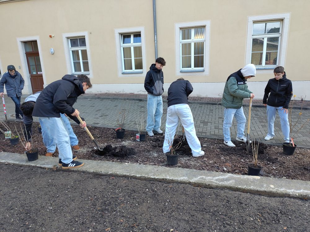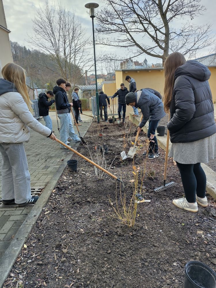 Im Zuge des Umzugs unserer Forsthütte ins Schulgelände und Nutzung als GTA-NAWI-Haus wurde jetzt noch der äußere Bereich um die Hütte fertiggestellt und das Pflanzen der Beerensträucher konnte am 27.11.24 durch das NAT-Profil 9 durchgeführt werden.