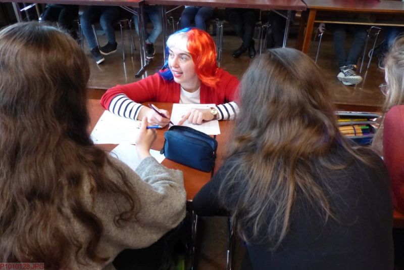Auch die Sprache sollte an diesem Tag nicht zu kurz kommen. Im Rahmen eines klassenstufenübergreifenden Projekts arbeiteten ausgewählte Klassen der Jahrgangsstufen 5, 6 und 8 zusammen. In zusammengestellten Gruppen spielten die 6. Klassen kurze Dialoge in französischer Sprache vor. Anschließend haben unsere 8. Klassen den Schülerinnen und Schülern der 5. Klassen einige Sätze auf Französisch beigebracht.