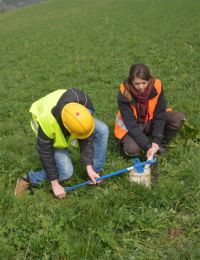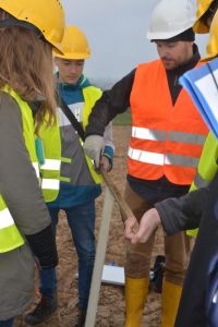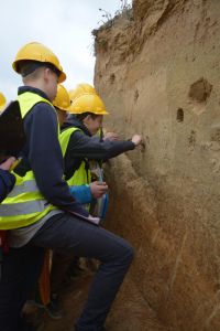 Aufgeteilt in kleinere Gruppen untersuchten die Schülerinnen und Schüler anschließend mit 1-Meter-Bohrstöcken den heute landwirtschaftlich genutzten Boden – die Kalksteinwände des Tagebaus dabei immer im Blick. Dadurch konnte auch die Beziehung zwischen den in den Kalkwerken hergestellten Produkten und derer zum Teil regionaler Nutzung in der Landwirtschaft, zum Beispiel als Düngekalk, hergestellt werden. In den eiszeitlichen Löss-Schichten, die an der Tagebauwand freigelegt sind, haben die Schüler ca. 7m unter der heutigen Oberfläche Zeugnisse vergangener, nicht durch den Menschen beeinflusster Klimawandel gefunden. Diese befanden sich in einem Boden aus der Eem-Warmzeit, der unter den Gesteinsstaub-Schichten der letzten Eiszeit begraben war.