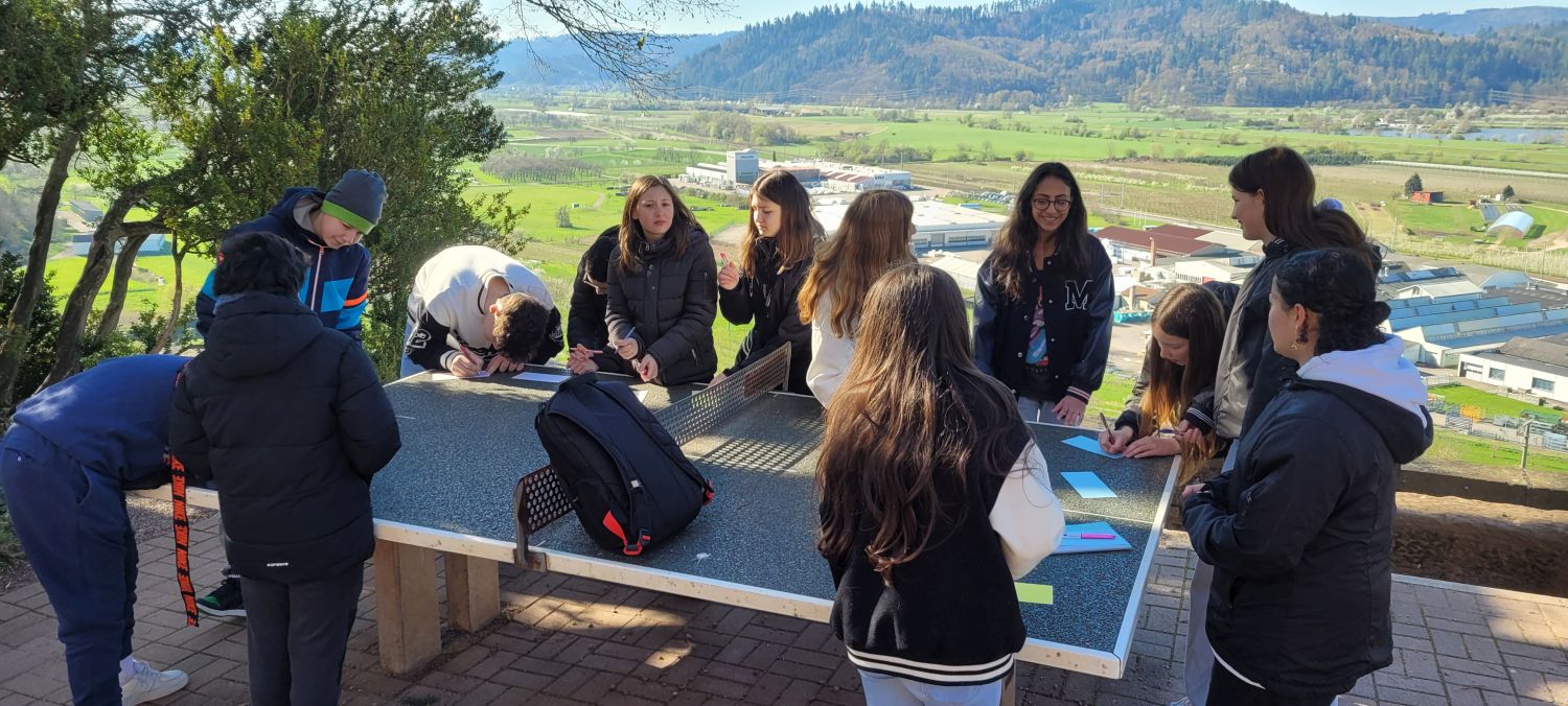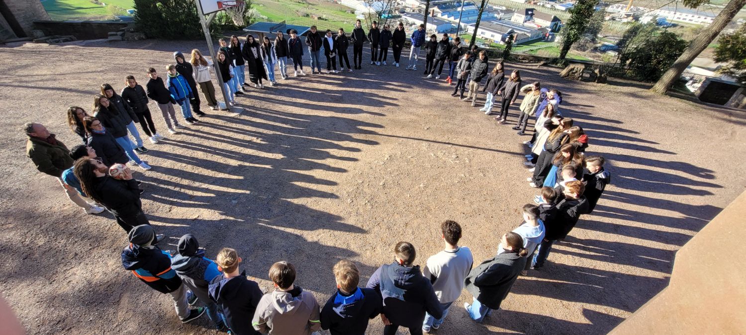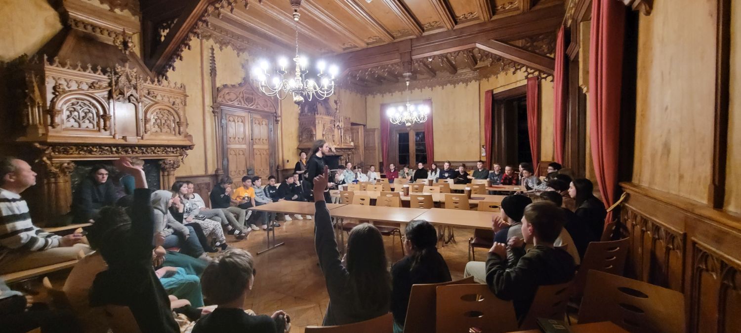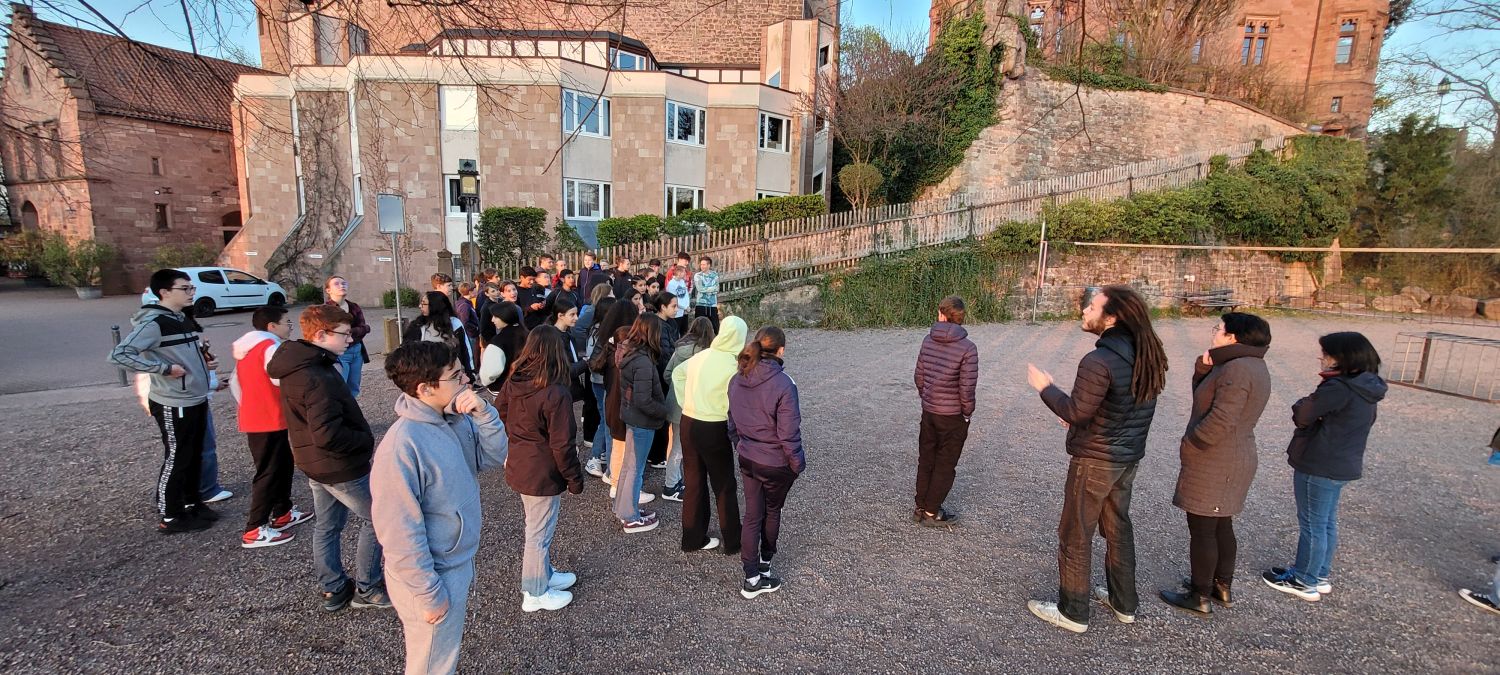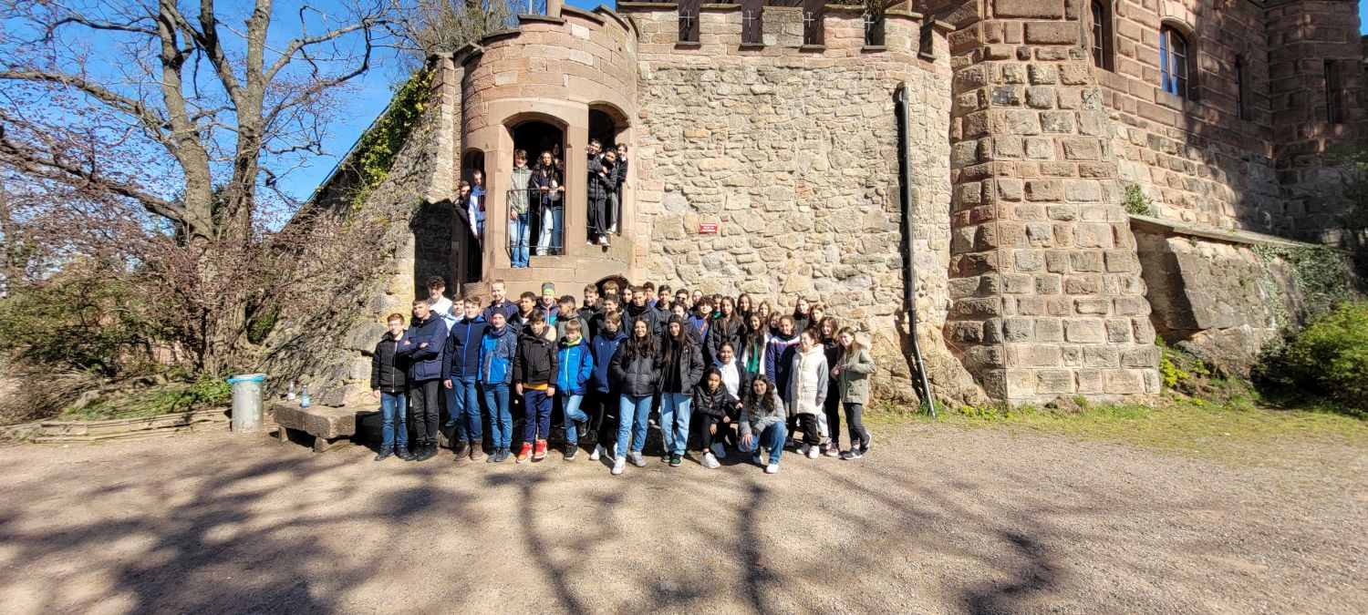 Am Dienstag war volles Programm, nach dem Frühstück war es Zeit, mit den Partnerschülerinnen und -schülern in Kontakt zu kommen. Unser Teamer Quentin organisierte verschiedene Aktivitäten, bei denen sich die Jugendlichen besser kennenlernen konnten, denn das mit den ganzen Namen war doch nicht so einfach. Anschließend wurden die Sprachkenntnisse geprüft, Interviews in Kleingruppen wurden geführt. Deutsch, Französisch und auch Englisch wurde genutzt, so wie es sich für einen interkulturellen Austausch gehört. Ein Gruppenfoto vor dem schönen Schloss Ortenberg durfte da nicht fehlen.