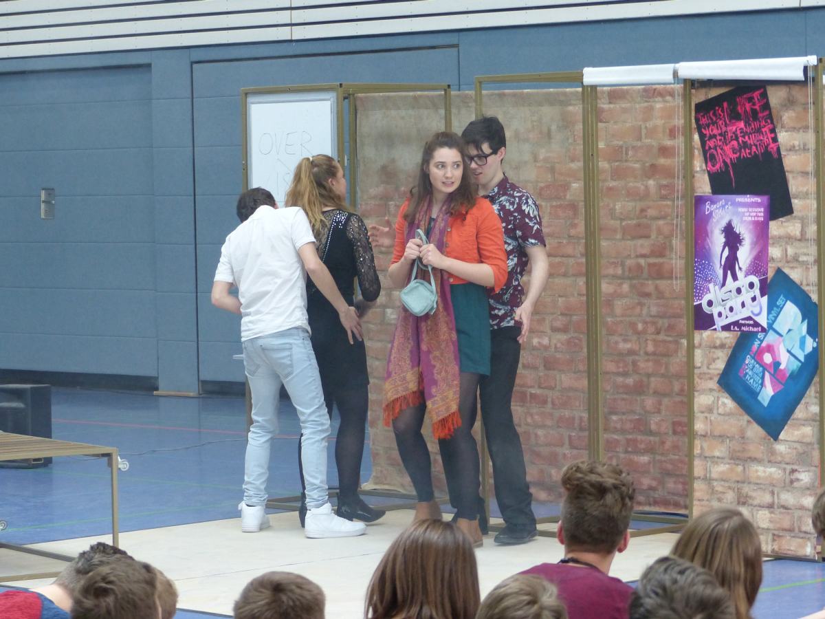 Das zweite Stück „Drinking or Dummies“ für die Mittelstufe handelte in dramatischer Weise von den negativen Auswirkungen übermäßigen Alkoholkonsums Minderjähriger. Eine neue Mitschülerin, Ella, und der etwas schüchterner Junge Barney finden langsam zueinander, werden aber durch den schon „reiferen“ Mitschüler Jake und dessen Freundin dazu verleitet, während eines gemeinsamen Abends in Jakes Zuhause und in einer Disco Wodka zu trinken. Besonders Jake forciert den Alkoholkonsum der beiden, die das Trinken von Alkohol nicht gewohnt sind. Am Ende des Abends wird Ella alkoholvergiftet in ein Krankenhaus eingeliefert und Barney wird beim Überqueren der Straße auf allen Vieren überfahren und stirbt. Dramatisch dargestellt und inszeniert soll uns das Stück an die Thematik des Alkoholmissbrauchs unter Jugendlichen heranführen. Lebendig und einfühlsam gespielt durch die vier Darsteller und unterstützt durch das sparsame, aber wirkungsvolle Bühnenbild, welches variantenreich geändert und zu verschiedenen Orten umfunktioniert wurde, gelang es den Schauspielern, diese Thematik den Zuschauern bildlich und sprachlich näher zu bringen.