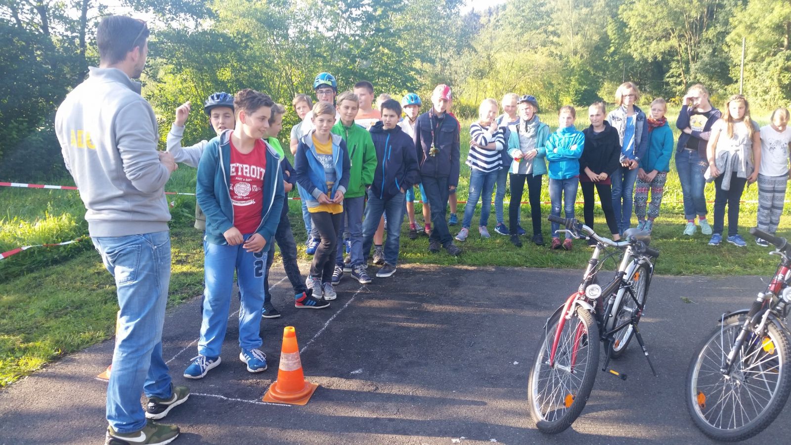 8.20 Uhr wurden alle Kinder belehrt und eingewiesen. Die Jungen begannen zuerst den Fahrradparcours zu überwinden. Man musste z. B. über ein Brett fahren und Slalom fahren. Während die Jungen zwei Übungsrunden und eine bewertete Runde absolvierten, halfen die Mädchen beim Bepunkten der Jungen oder sahen zu. 8.45 Uhr waren die Jungen Helfer oder Zuschauer und die Mädchen absolvierten den Parcours.
