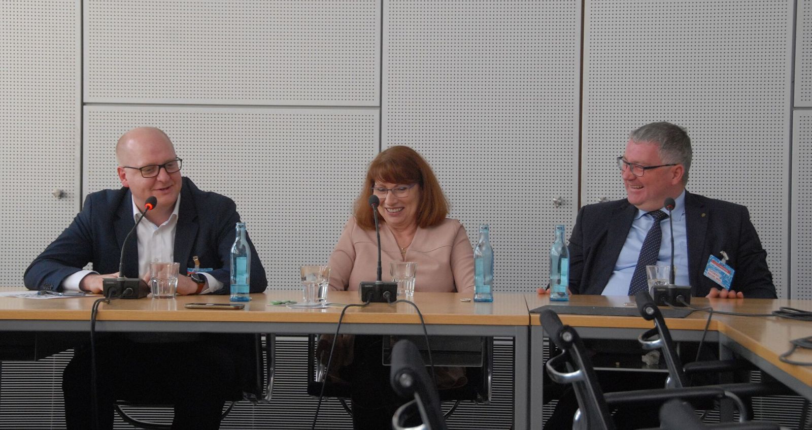 Kaum hatten wir den Veranstaltungsraum erblickt, wurde einer nach dem anderen von der super modernen Ausstattung, den langen Tischreihen, reich bedeckt von buntem Obst, frischen sowie heißen Getränken und auch exquisit belegten Brötchen, fasziniert und ergriffen. „Setzt euch und greift ruhig schon zu“, wurden wir begrüßt. Das ist wohl ziemlich schwierig umzusetzen, wenn man als erste Gruppe ankommt und nicht gleich von allen anderen als „Dorfgymnasium“ ohne jegliche Manieren abgestempelt werden will. Bald stießen auch die anderen Teilnehmer des Tages sowie Mitarbeiter der SPD zu uns. Nach einem kurzen Snack, weil die Brötchen vom Anschauen ja nicht besser werden, begannen wir den „offiziellen Aktionstag“ mit einer kleinen Vorstellungsrunde, bei der wir die Mikrofone an unseren Plätzen einweihten.