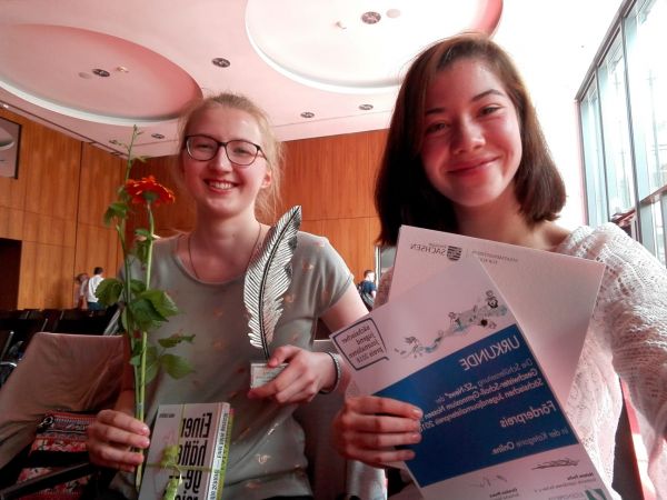 Mit der Freude, etwas gewonnen zu haben, fanden wir dann auch den sogenannten Mediencampus - modern, stilvoll und elegant. Im Campus selber wurden wir als Zuspätkommer trotzdem nett begrüßt und sahen dann die vielzählige jungen Journalisten aus dem Raum der Preisverleihung herausströmen. Der erste Teil der Verleihung war vorbei - nichtsdestotrotz bekamen wir unseren Preis: eine wunderschön gestaltete Feder als „Trophäe“, zwei Bücher als Geschenk, eine Urkunde sowie unseren Bewertungsbogen.