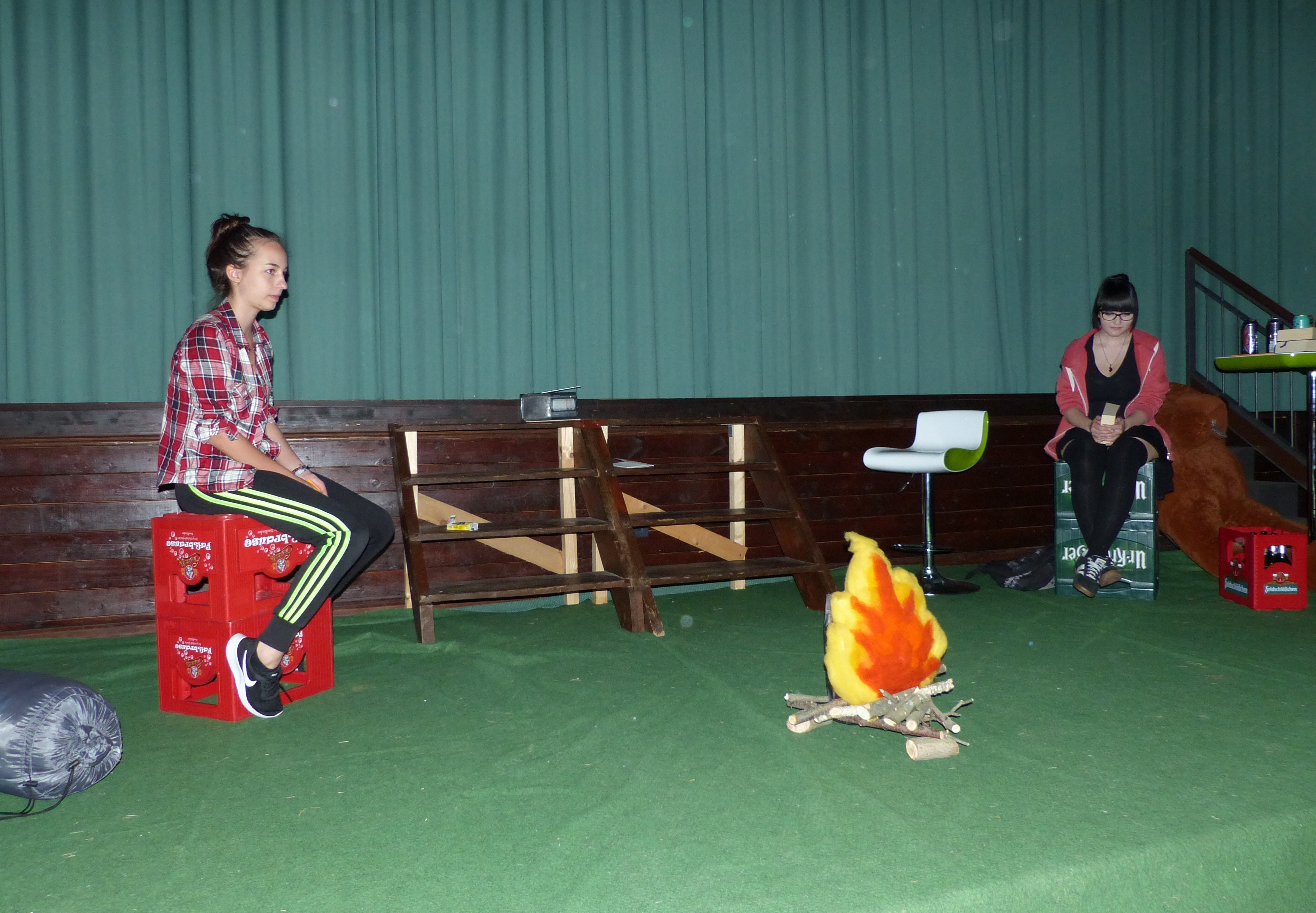 "Viele mussten sich zusammenreißen, dass sie nicht so laut quatschen, dass das Publikum alles Wort für Wort mithört, und die anderen mussten die "Quatscher" ausbremsen. Mitgefiebert haben wir auch, aber nur an "markanten" Stellen, wie die mit der sehr speziellen Elfe. Da standen alle auf einem Haufen, damit jeder etwas sehen kann. Sonst haben wir eher weniger mitgefiebert, im Gegenteil, Leute mit wenig Text und Bühnenauftritten haben sich teilweise sogar etwas gelangweilt, da man natürlich auch nicht so zuschauen kann, wie das Publikum. Auch als Souffleur bzw. Souffleuse wurden Leute eingeteilt, vor allem von Schauspielern, die wussten, dass der kommende Text eher weniger sitzt. Auf die Bühne zu gehen hat, soweit ich weiß keiner verpasst, man wurde nur ab und zu daran erinnert, dass man gleich dran ist, sodass wirklich nichts schief geht."