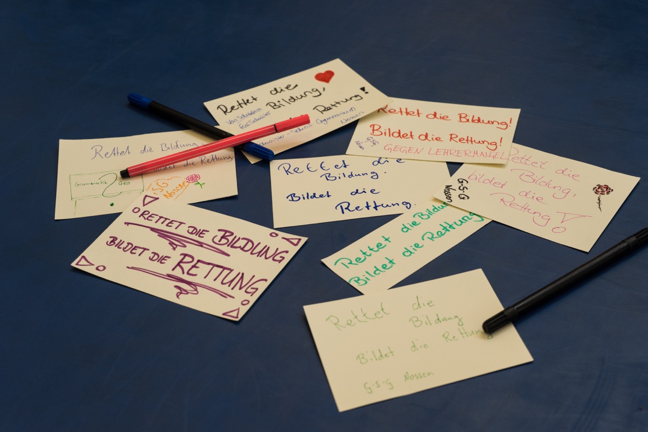 Um ein Zeichen zu setzen, wurden von einigen Schülern Plakate mit der Unterstützung von Frau Heidenreich und Herrn Brünig gestaltet, während eine andere Gruppe in der Turnhalle Heliumluftballons vorbereitete. Auf kleinen Schildern, die im Nachhinein an die Ballons geknotet wurden, konnte sich jeder unter dem Motto „Rettet die Bildung! Bildet die Rettung!“ kreativ austoben.